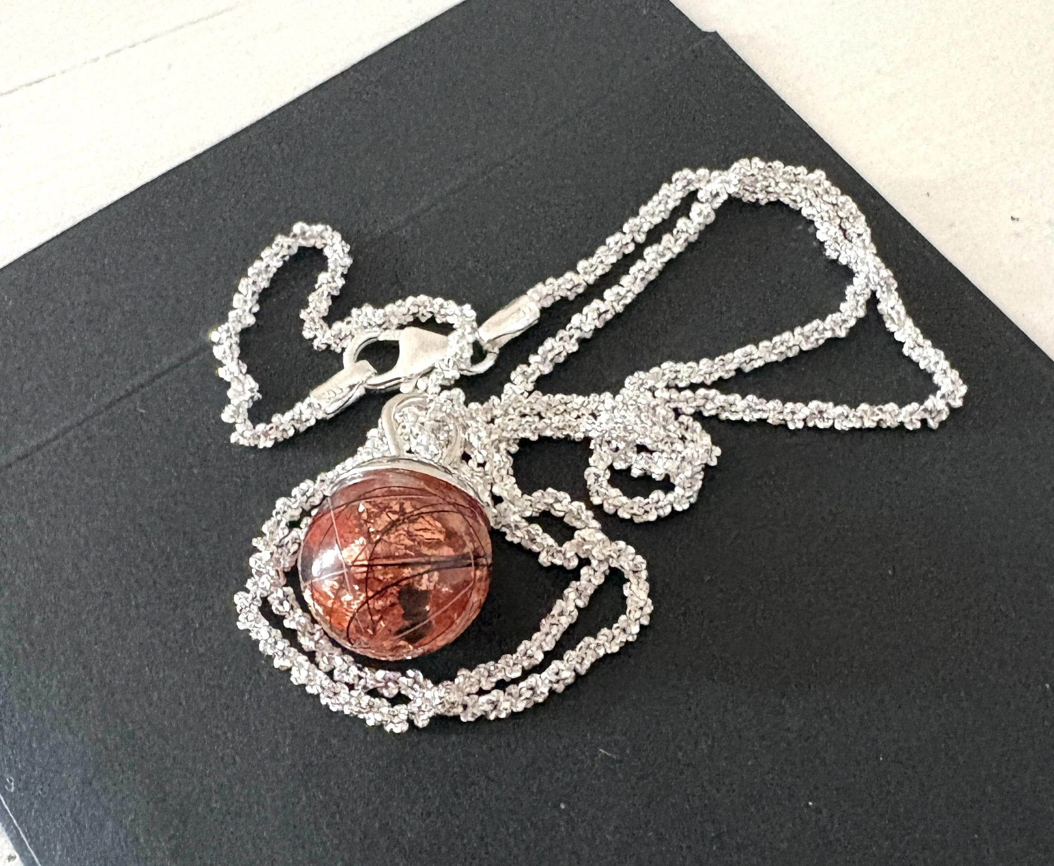 2 Ti mm. kugle med indstøbte hestehår, topplade i oxyderet sølv og charms i forgyldt sølv med aftryk af kundens hestehår. Sølvkæde forgyldt med 14 karat guld. Forbrug 10 hestehår. Pris for kugle 1000,-, kæde 300,-, forgyldt vedhæng i sølv 250,-