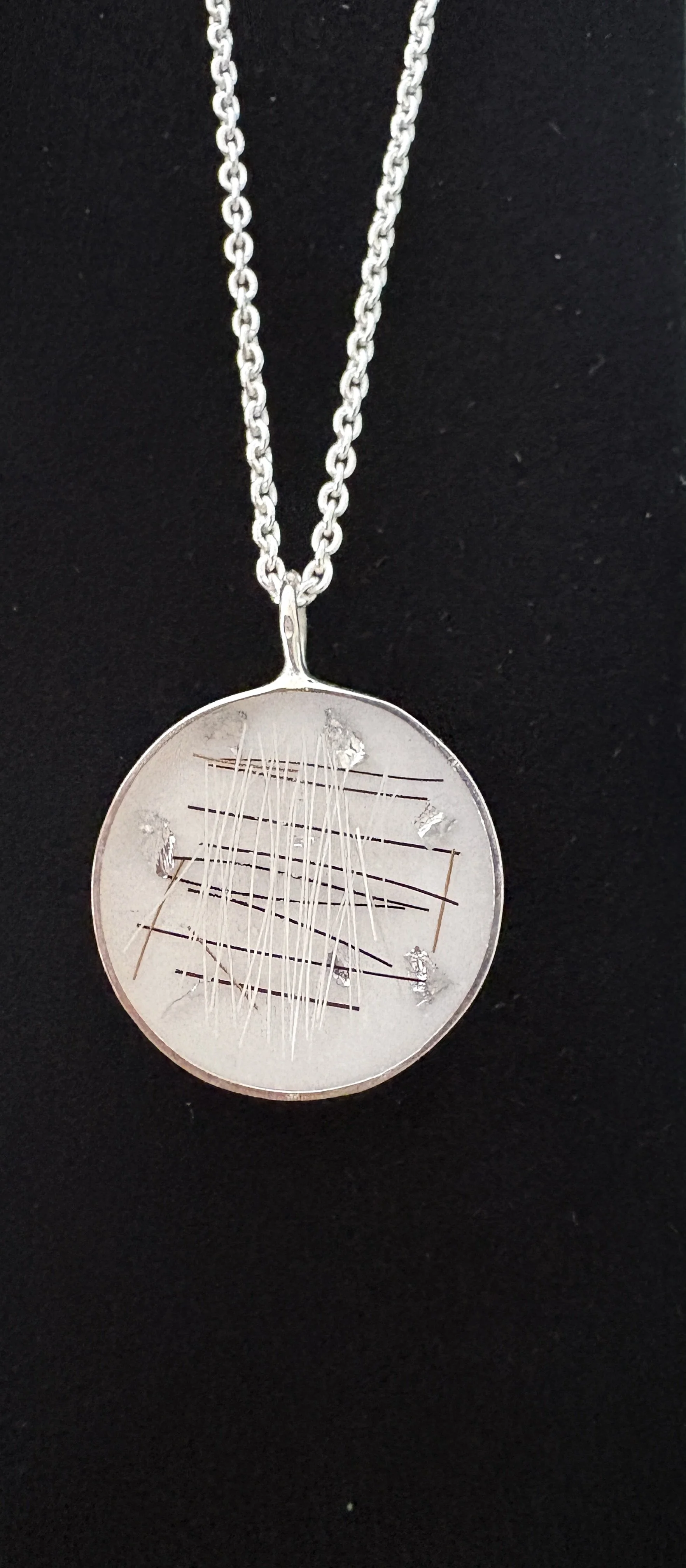 1.A Håndsmedet sølvvedhæng ca. 20 mm. i diameter- forgyldt med 14 karat guld- indstøbte hestehår og bladguld. Pris 1200,- uden kæde. Kæde 42 eller 45 cm. 300,-