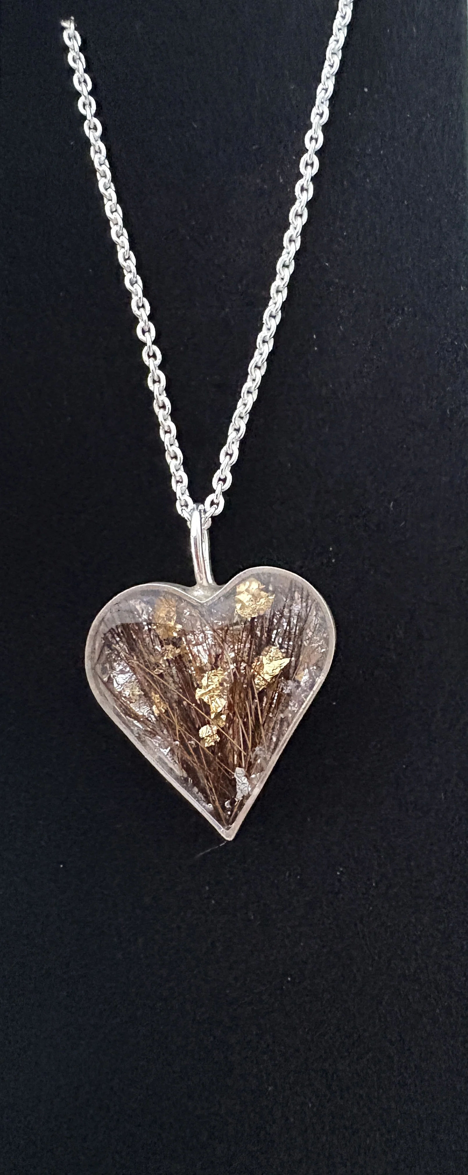 9. Håndsmedet sølvhjerte med indstøbte hestehår. Hjertet måler ca. 1,5x1,5cm. Kædemål 45cm. Pris 1100,-. kæde 235,- Forbrug 5 hestehår. Forgyldt plus 200,-